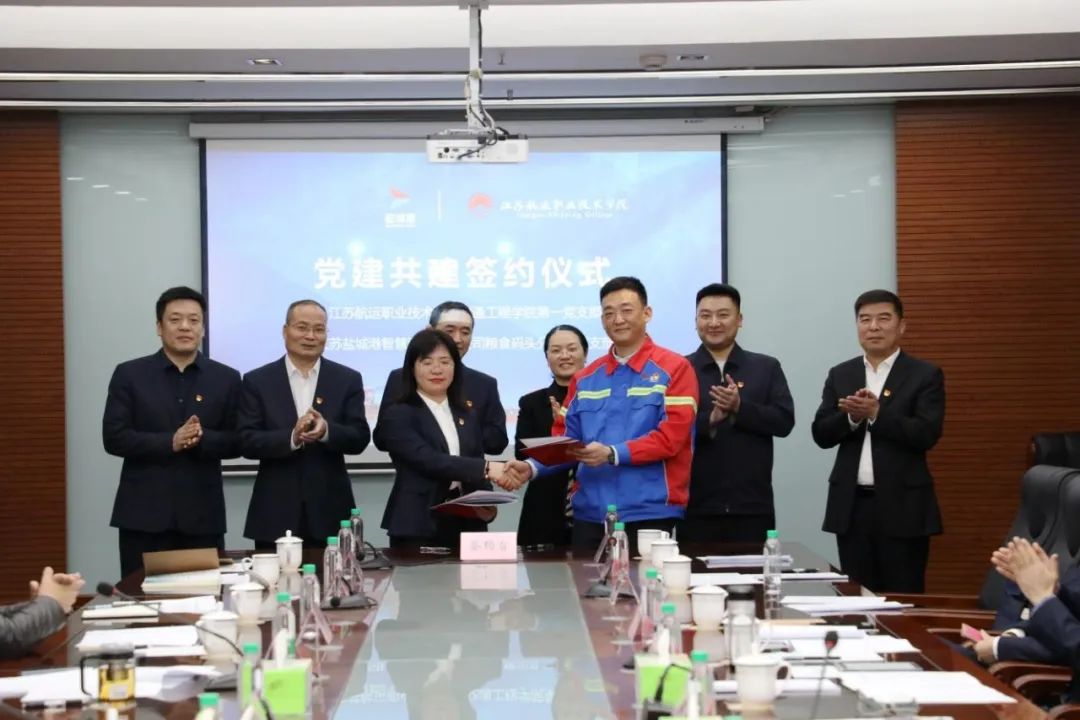 活動分為主題黨日活動和現場觀摩兩個階段。主題黨日活動上,鹽城港智慧港口有限公司糧食碼頭分公司黨支部書記和江蘇航運學院交通工程學院第一黨支部書記上臺簽訂黨建共建協議,決定就組織共建、人才共育、發展共促、資源共享建立長期、穩定的協作關系,標志著雙方結對成功,正式確立為黨建共建單位。隨后,校企雙方圍繞黨建共建、人才培養、實習就業、產教融合等方面展開進一步交流,并針對校企資源優勢雙向賦能進行探討,以期拓展中長期戰略合作新模式,形成常態化、規范化、精準化共建體系。會議結束后,與會人員參觀了江蘇鹽城港智慧港口有限公司糧食碼頭分公司集裝箱碼頭和黨建陣地。