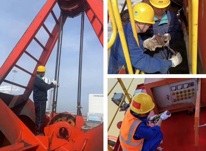 烈日下的吊臂“熱辣滾燙”,射陽港區通過研判高溫會導致輸油密封組件磨損失效、潤滑油變質鋼絲繩磨損加劇,為防止潤滑不良帶來的運行隱患。組織生產、保障班組根據“四大機構”運行特點開展非計劃停機專項整頓行動,檢查管路400余米、更換穩壓油管6節、疏通管頭接口22個,有效地排除了設備運行隱患。