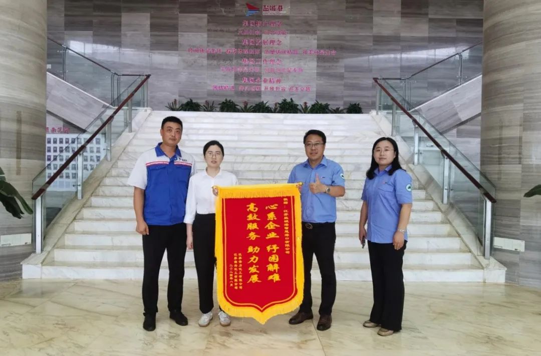 近日,江蘇海力化工有限公司和江蘇海興化工有限公司將一面印有“心系企業 紓困解難 高效服務 助力發展”的錦旗送到鹽城港智慧港口公司,對智慧港口公司在船舶作業期間優質專業高效的服務表示感謝。