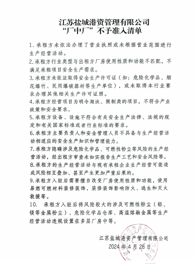 (三)加強風險源頭管控,制定不予準入清單,出租的廠房須滿足承租項目安全生產需求,違反規定改變廠房使用性質、不符合工程建設安全標準的不得出租;承租項目必須符合產業政策和安全要求,存在突出風險相互疊加或重大事故隱患未按規定整改等問題的要堅決清退,不具備安全生產條件以及明令淘汰、限制類項目不得租賃廠房進行生產。不予準入清單報屬地監管部門審核。