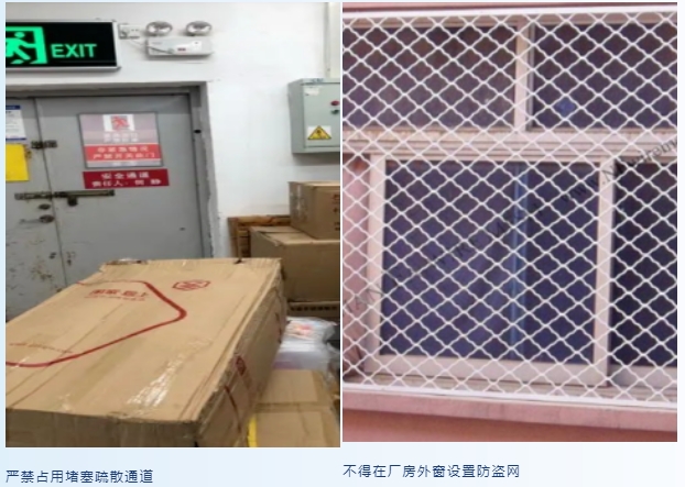 (十五)嚴禁占用堵塞疏散通道、安全出口,不得在廠房外窗設置鐵柵欄、防盜網。