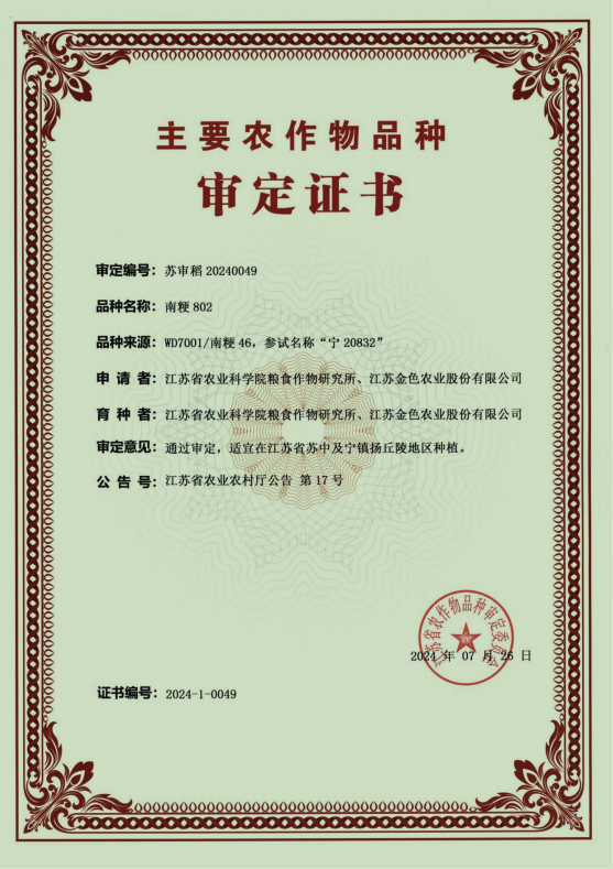 日前,農業科技集團與江蘇省農業科學院糧食作物研究所合作選育的水稻新品種“南粳802”通過江蘇省品種審定。這是繼2020年共同選育通過審定的第一個水稻品種“南粳7718”后,又一個通過省級審定的水稻新品種。