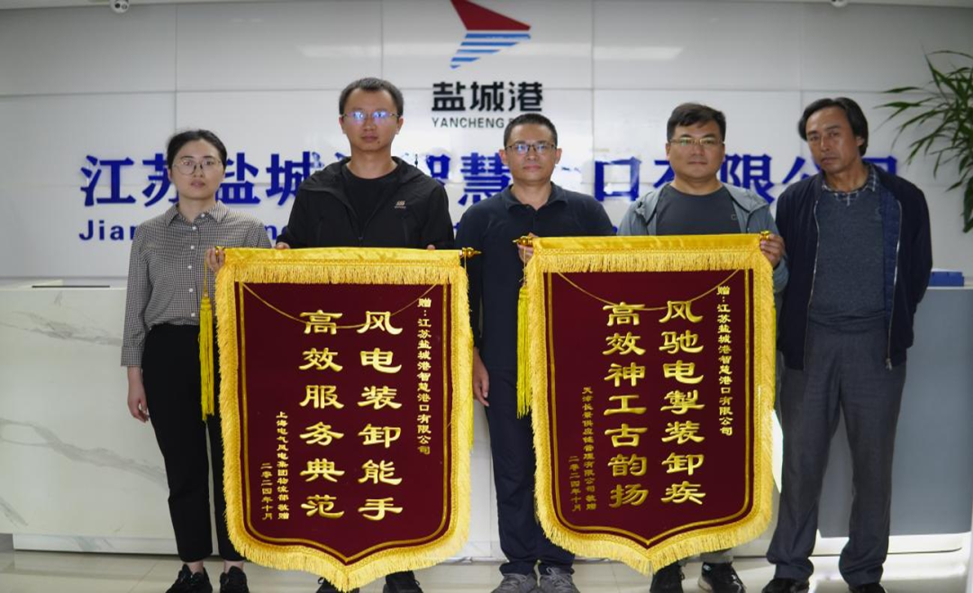 近日,智慧港口公司收到天津長(zhǎng)景供應(yīng)鏈管理有限公司和上海電氣風(fēng)電集團(tuán)物流部送來(lái)寫(xiě)有“風(fēng)馳電掣裝卸疾,高效神工古韻揚(yáng)”“風(fēng)電裝卸能手,高效服務(wù)典范”字樣的兩面錦旗,字里行間,映照著客戶對(duì)鹽城港裝卸服務(wù)最誠(chéng)摯的謝意和加倍的認(rèn)可。