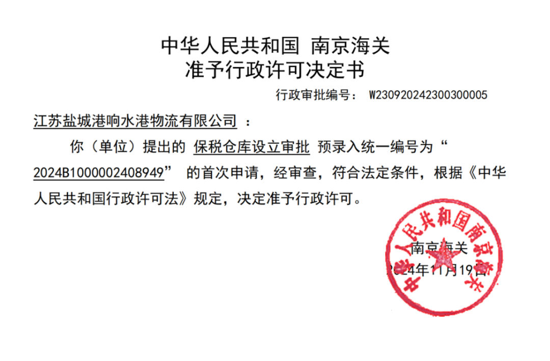 經(jīng)過(guò)一系列申報(bào)、審批流程,響水港物流有限公司公用型保稅倉(cāng)成功獲得南京海關(guān)的行政許可,并于12月2日下發(fā)行政許可決定書。標(biāo)志著響水地區(qū)首個(gè)“公用型保稅倉(cāng)庫(kù)”正式批準(zhǔn)設(shè)立。