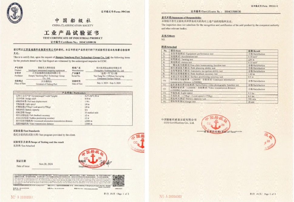 今年以來,鹽城港科技集團積極響應國家交通強國發展規劃,推動行業智能裝備應用,助力鹽城港集團港口設備智能化改造和數字化升級工作。近日,科技集團“鹽港一號”智能無人測繪裝備獲得中國船級社質量認證有限公司頒發的工業產品試驗證書,標志著集團測繪工作正式進入新階段。