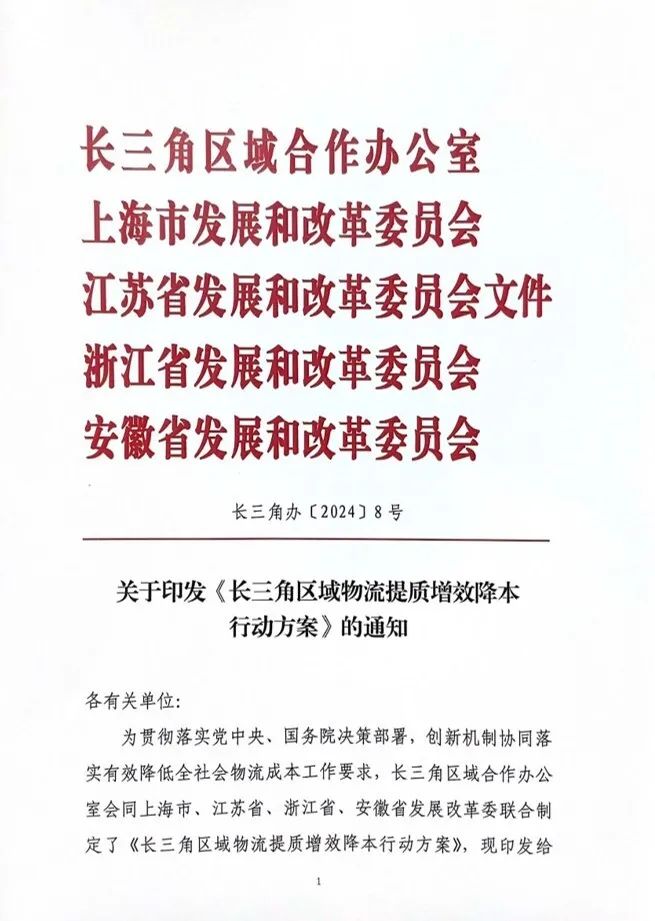 為貫徹落實黨中央、國務院決策部署,創新機制協同落實國家層面有效降低全社會物流成本工作要求,推動降低長三角區域物流成本、提高經濟運行效率,長三角區域合作辦公室、上海市發展改革委、江蘇省發展改革委、浙江省發展改革委、安徽省發展改革委聯合印發《長三角區域物流提質增效降本行動方案》,明確了7方面37項具體舉措。