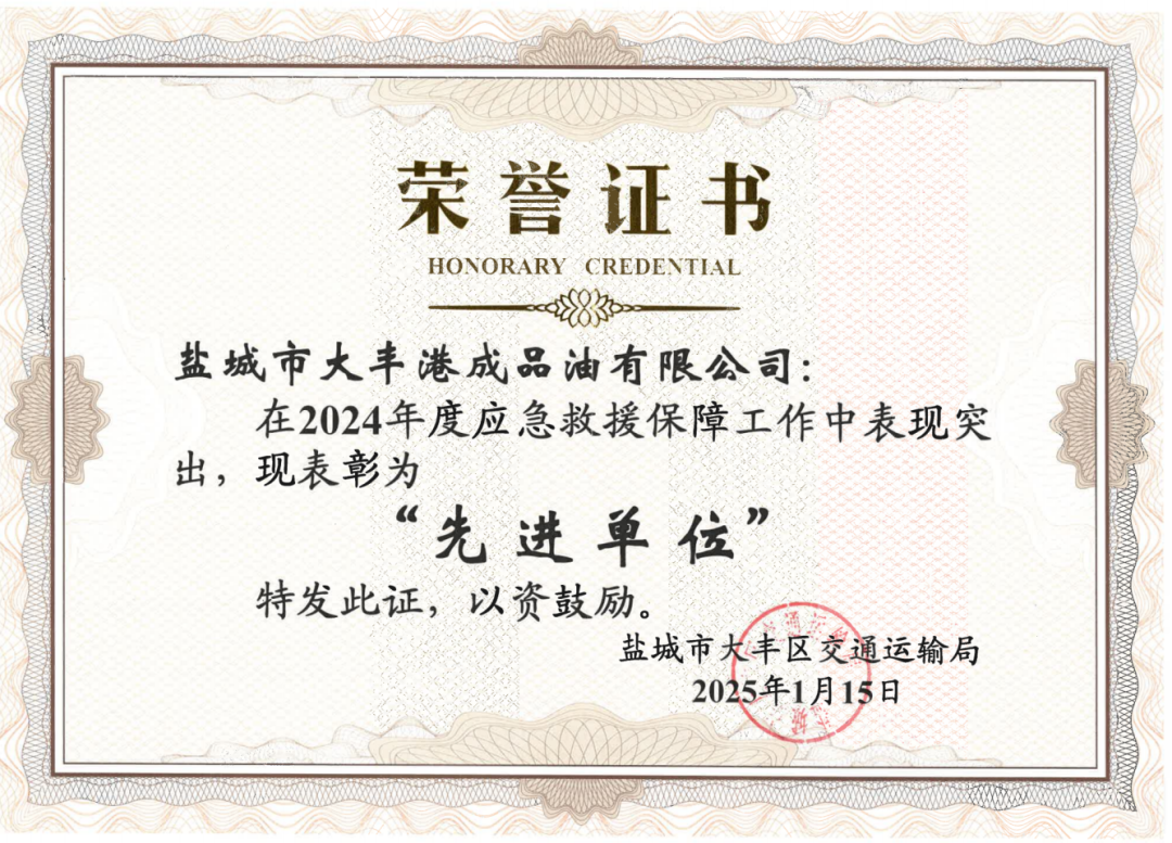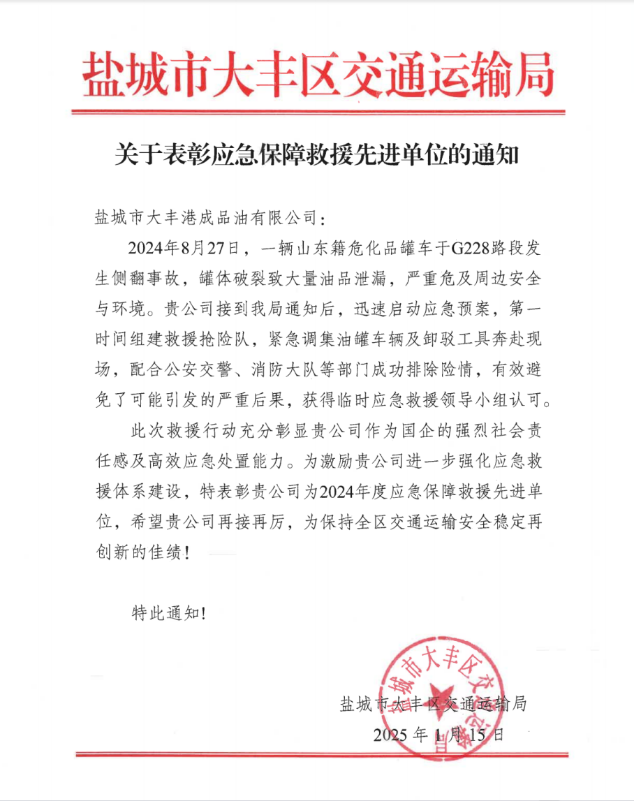 近日,鹽城市大豐區交通運輸局將一份“2024年度應急保障救援先進單位”榮譽證書頒發給成品油公司,以表彰該公司在2024年8月的一次應急救援行動中,展現的卓越的應急響應能力和高度的社會責任感。