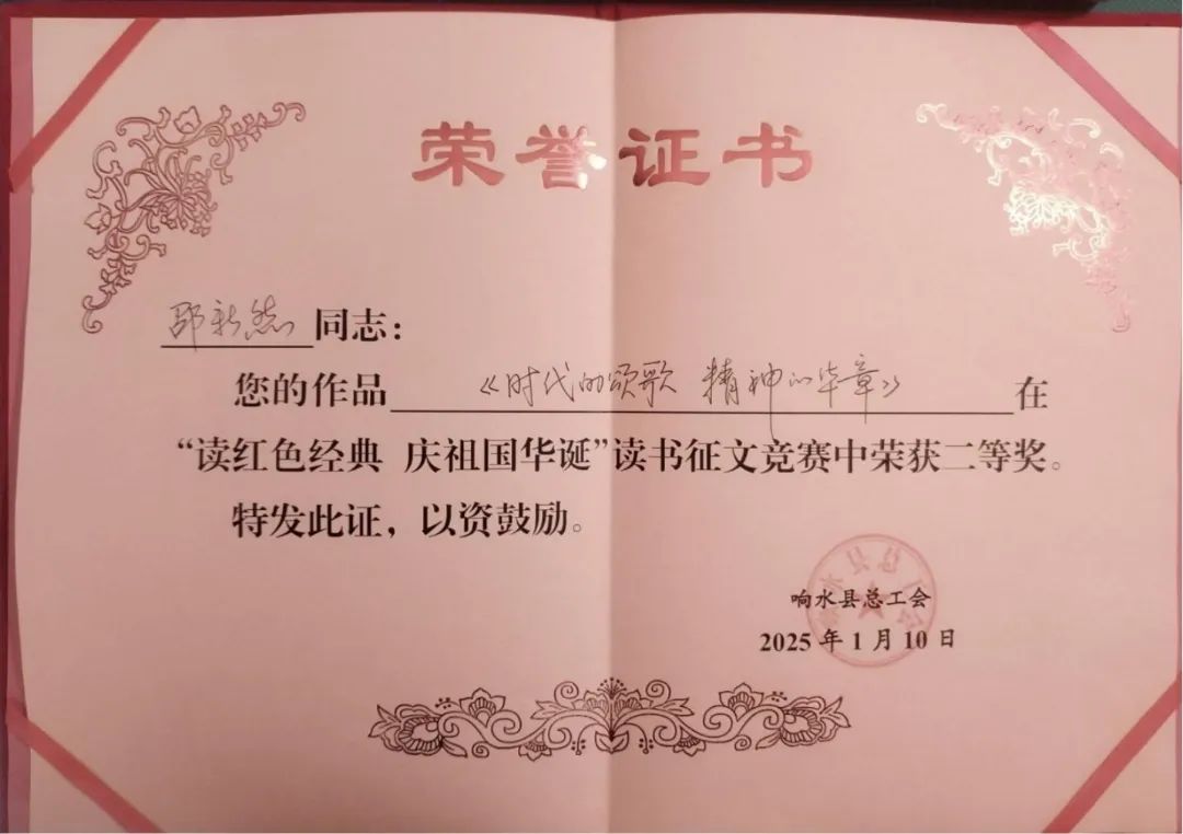 近日,由響水縣總工會舉辦的2024年度“讀紅色經典、慶祖國華誕”職工讀書征文競賽活動結果相繼公布,江蘇響水港物流有限公司業務組邵新然的《時代的頌歌,精神的華章》在眾多作品中脫穎而出,榮獲征文競賽二等獎。