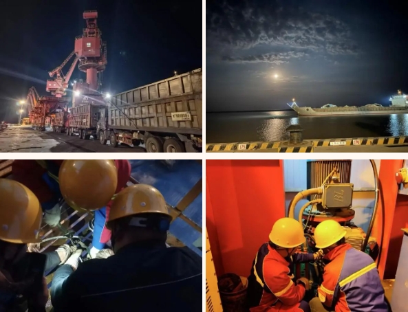 星斗轉(zhuǎn)移間,港區(qū)燈火織就金色蛛網(wǎng)。維保員謝凱登上7#門機,在操作司機進行作業(yè)前試運行時,由下而上逐項檢查“四大機構(gòu)”各鉸點工況,這個已經(jīng)從業(yè)達十年的“設備醫(yī)生”,各個異常部件,都逃不過他的“聽診”;此刻,碼頭上4臺門機、16輛短駁車輛正接受作業(yè)前深度“體檢”,設備完好率99.9%的紀錄在月光下悄然刷新;遠處傳來貨輪悠長的汽笛,現(xiàn)場調(diào)度員使用高頻指揮著船舶乘潮進港,用精準、精致將潮汐、貨種、作業(yè)效能編織成最優(yōu)解的算式。