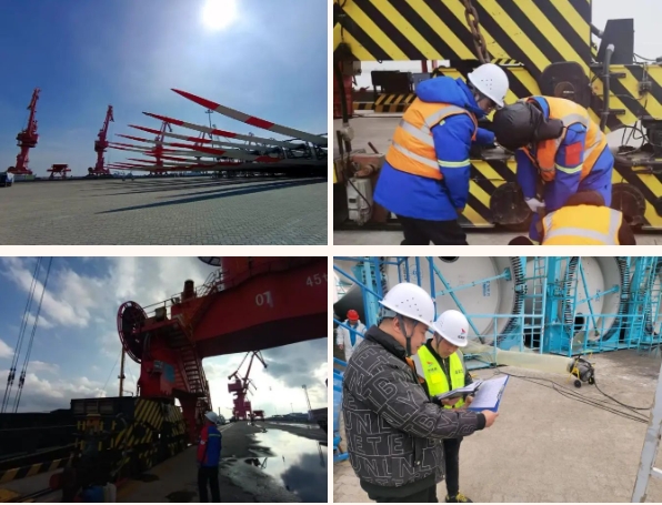 乍暖還寒的天氣,掩不住悄然開放的迎春花香漫過大件堆場,95后的巡查員正在研判著123米葉片堆碼安全間距。“前端對齊,仰角30°,符合要求,可以落鉤”,他和現(xiàn)場安全員溝通的聲音驚飛了棲息在高桿燈防撞桿上的白鷺;500米外的消防泵站檢修現(xiàn)場,消防維保員踩著管道內(nèi)清理出的沒過雨靴的淤泥,“通了、通了”興奮的高聲喊叫。