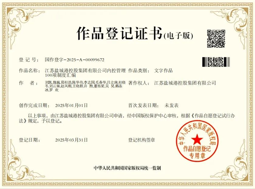 喜報!鹽城港集團《內控管理100項制度匯編》榮獲國家版權局作品登記證書