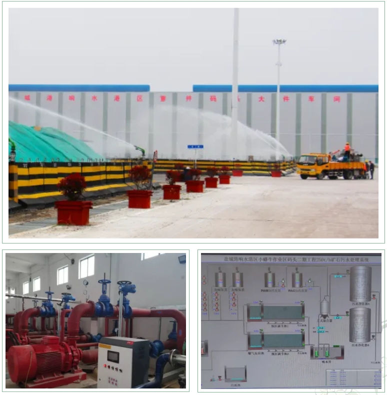 創新引入“分質水循環+負碳工藝”概念:利用現有“三站”與湖水打通引湖造景的同時,利用湖水曝氣作用實現生態無害化處理生成“再生水”,用于綠化澆灌與堆場噴淋,年預計減少堆場污水超數十萬噸、節約市政用水成本45%、驅動生產單元降耗17%、碳強度下降23%,實現“三水”閉環的綠色發展模式,同時汛期可以有效降低85%的內澇風險。后續聯動現有堆場噴淋和粉塵監測系統,根據風、塵信息實時調控,既降塵抑污,又提升作業環境質量,實現水資源高效循環利用,形成可復制的綠色生態發展新模式。
