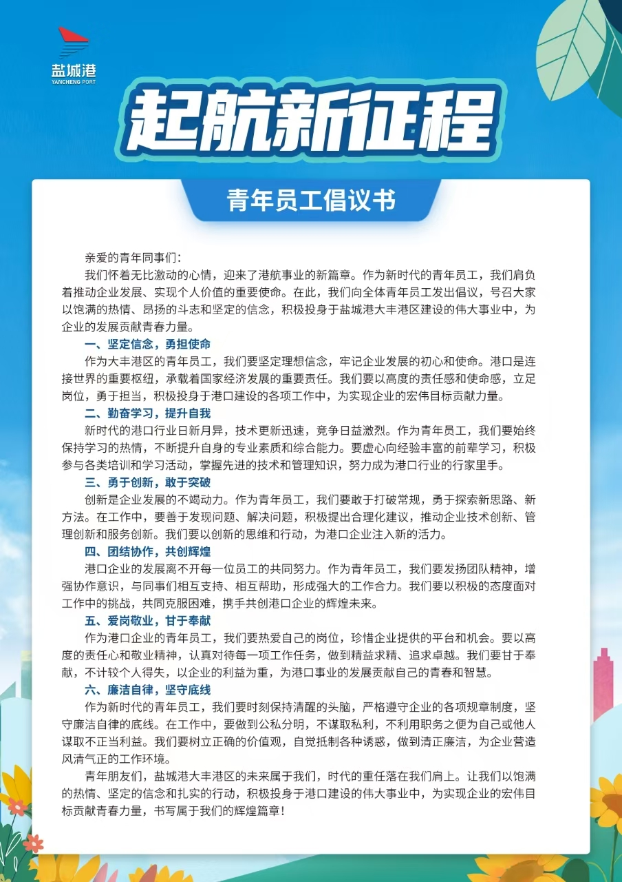 深入機關、碼頭一線、項目建設現場,發放《起航新征程——青年員工倡議書》200余份,號召廣大青年,以飽滿的熱情、昂揚的斗志和堅定的信念,積極投身于鹽城港大豐港區建設的偉大事業中,為億噸大港建設貢獻青春力量。