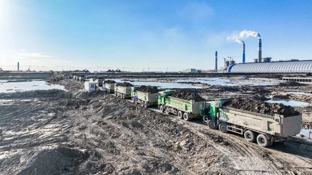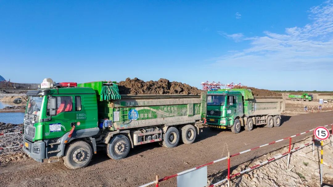 多臺(tái)挖掘機(jī)、運(yùn)輸車往來穿梭