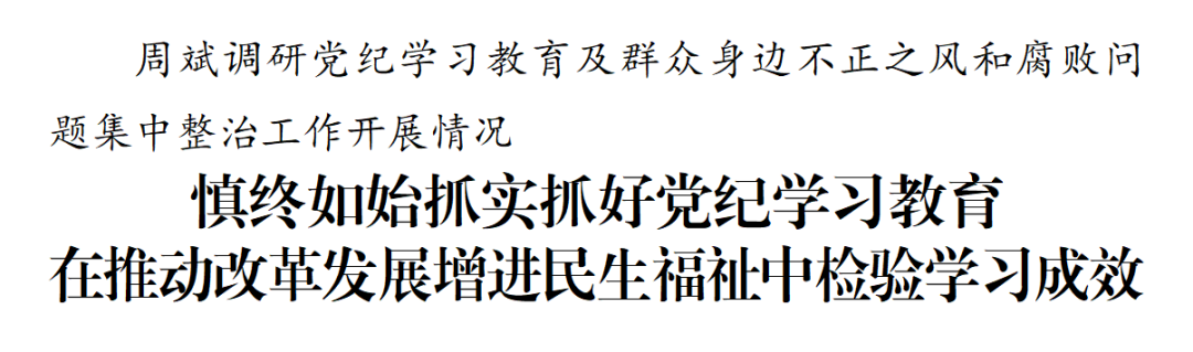 周斌在調(diào)研中指出,黨紀(jì)學(xué)習(xí)教育要強(qiáng)化原文研學(xué),深學(xué)細(xì)悟習(xí)近平總書(shū)記關(guān)于全面加強(qiáng)黨的紀(jì)律建設(shè)的重要論述,堅(jiān)持融入日常、抓在經(jīng)常,持續(xù)在深化內(nèi)化轉(zhuǎn)化上下功夫,引導(dǎo)黨員干部更好把遵規(guī)守紀(jì)刻印在心。要強(qiáng)化警示教育,用好紅色資源、鮮活案例和生動(dòng)現(xiàn)場(chǎng),加強(qiáng)正面引導(dǎo)和反面警示,讓黨員干部受警醒、明底線、知敬畏,真正做到知行知止。要強(qiáng)化學(xué)用結(jié)合,堅(jiān)持兩手抓、兩促進(jìn),將黨紀(jì)學(xué)習(xí)教育與整治形式主義為基層減負(fù)、整治群眾身邊不正之風(fēng)和腐敗問(wèn)題、推進(jìn)經(jīng)濟(jì)社會(huì)高質(zhì)量發(fā)展相結(jié)合,在嚴(yán)格約束下積極擔(dān)當(dāng)作為,切實(shí)把學(xué)習(xí)成效轉(zhuǎn)化為推動(dòng)改革發(fā)展、增進(jìn)民生福祉的實(shí)際舉措,真正讓黨員受教育、發(fā)展見(jiàn)成效、群眾得實(shí)惠。