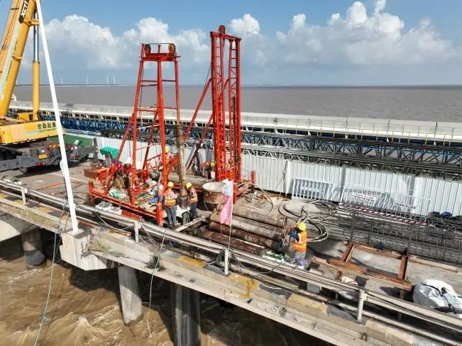 因歷時(shí)長(zhǎng)久、負(fù)荷飽滿,引橋29#至35#排架橫梁、樁基、上部空心梁板受到不同程度的損壞,對(duì)引橋的正常使用造成一定影響。鹽城港港灣建設(shè)集團(tuán)立即成立引橋搶修項(xiàng)目組,多次進(jìn)行現(xiàn)場(chǎng)踏勘,召開引橋修復(fù)設(shè)計(jì)評(píng)審會(huì)、組織人員設(shè)備進(jìn)場(chǎng)施工。由于搶修項(xiàng)目具有“急、難、險(xiǎn)”的特點(diǎn),引橋搶修項(xiàng)目組合理分配人材機(jī)的投入,爭(zhēng)分奪秒,倒排工期、掛圖作戰(zhàn),確保了該搶修工程的順利進(jìn)行。據(jù)項(xiàng)目現(xiàn)場(chǎng)負(fù)責(zé)人介紹,該項(xiàng)目將于施工后85天內(nèi)完成,比計(jì)劃工期縮短5至7天。