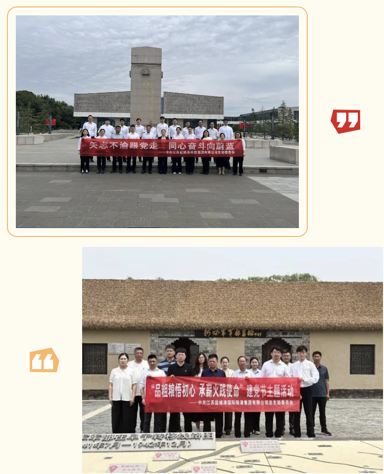 時代見證奮進腳步,征程譜寫嶄新篇章。在中國共產黨成立 104周年之際,鹽城港集團各基層黨組織深入學習貫徹習近平新時代中國特色社會主義思想,以黨建領航為統領,精心組織開展了“重溫誓詞守初心”“政治生日強黨性”“警示教育筑防線”“紅聯共建聚合力”“志愿服務暖民心”等系列主題活動,賡續紅色血脈,凝聚奮進力量,為集團高質量發展注入強勁紅色動能。