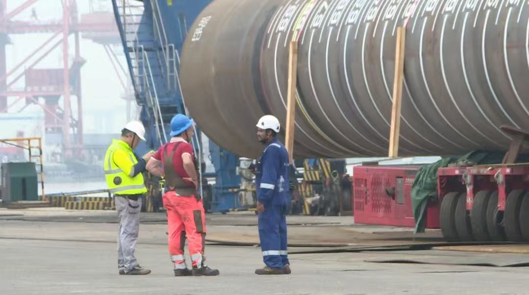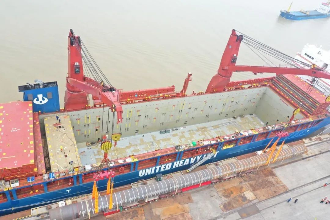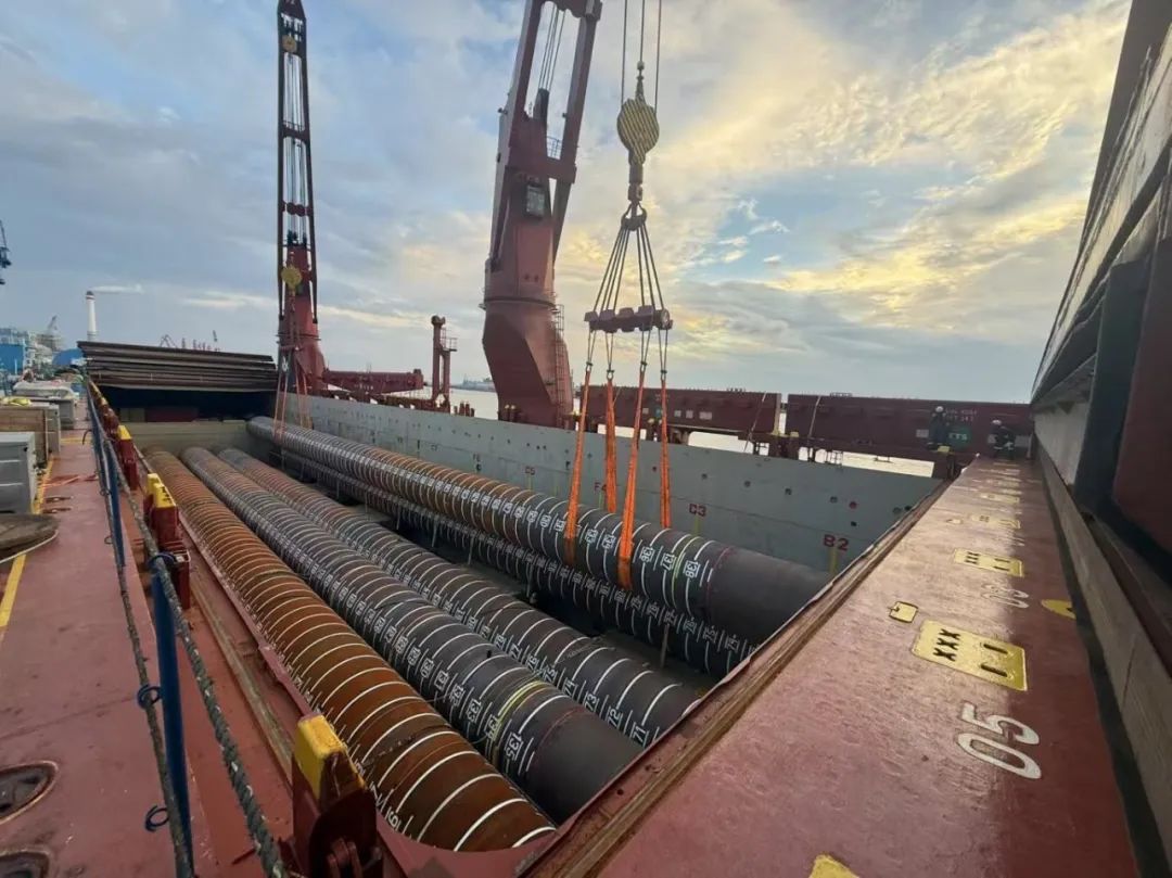 “幸福號(hào)”貨輪承載著江蘇天能海洋重工有限公司精心制造的尖端管樁裝備,這些“大國重器”將遠(yuǎn)赴中東,為當(dāng)?shù)赜蜌赓Y源開發(fā)提供關(guān)鍵基礎(chǔ)設(shè)施支持。全船共裝載45件管樁及配套鋼結(jié)構(gòu),其中管樁長度普遍超過40米,最長達(dá)76.8米,單件最大重量突破377噸,堪稱“海上鋼鐵巨龍”。