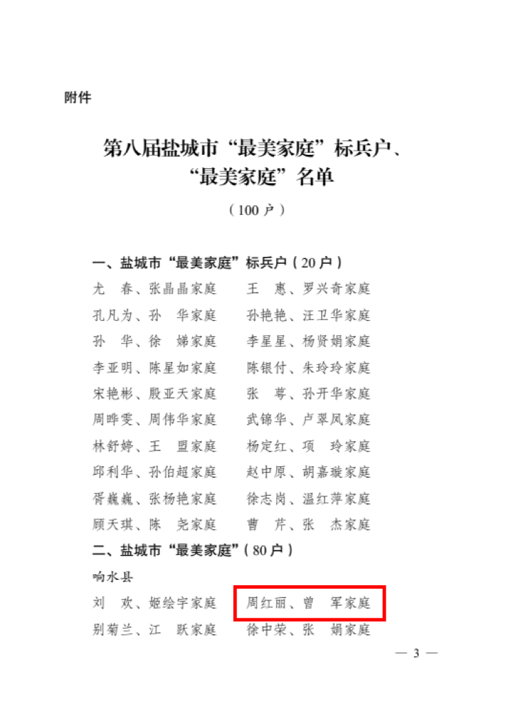 近日,從鹽城市婦女聯(lián)合會(huì)傳來好消息,在市第八屆鹽城市“最美家庭”評(píng)選活動(dòng)中,鹽城港響水港區(qū)曾軍家庭榮獲鹽城市“最美家庭”稱號(hào)。