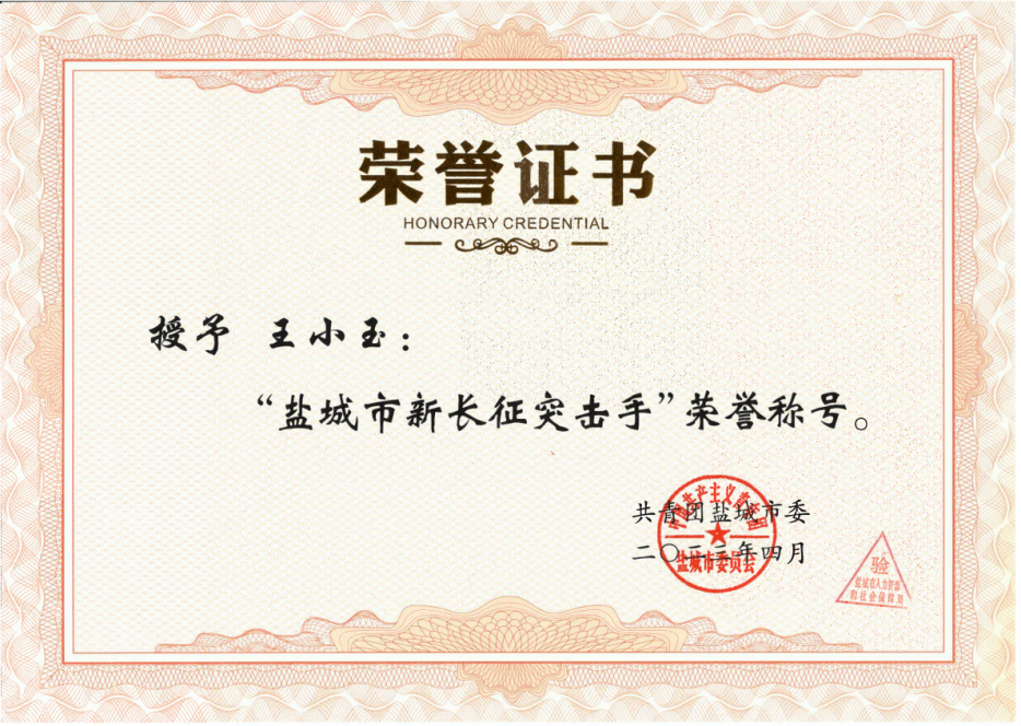 近日,共青團鹽城市委發(fā)布關(guān)于表彰“鹽城市兩紅兩優(yōu)”及“鹽城市新長征突擊手”的決定,集團王葉娜、陳詩語、王小玉三名同志分別榮獲“鹽城市優(yōu)秀共青團干部”“鹽城市優(yōu)秀共青團員”“鹽城市新長征突擊手”榮譽稱號。